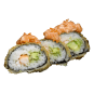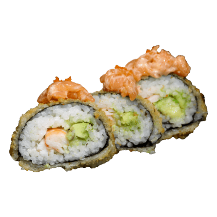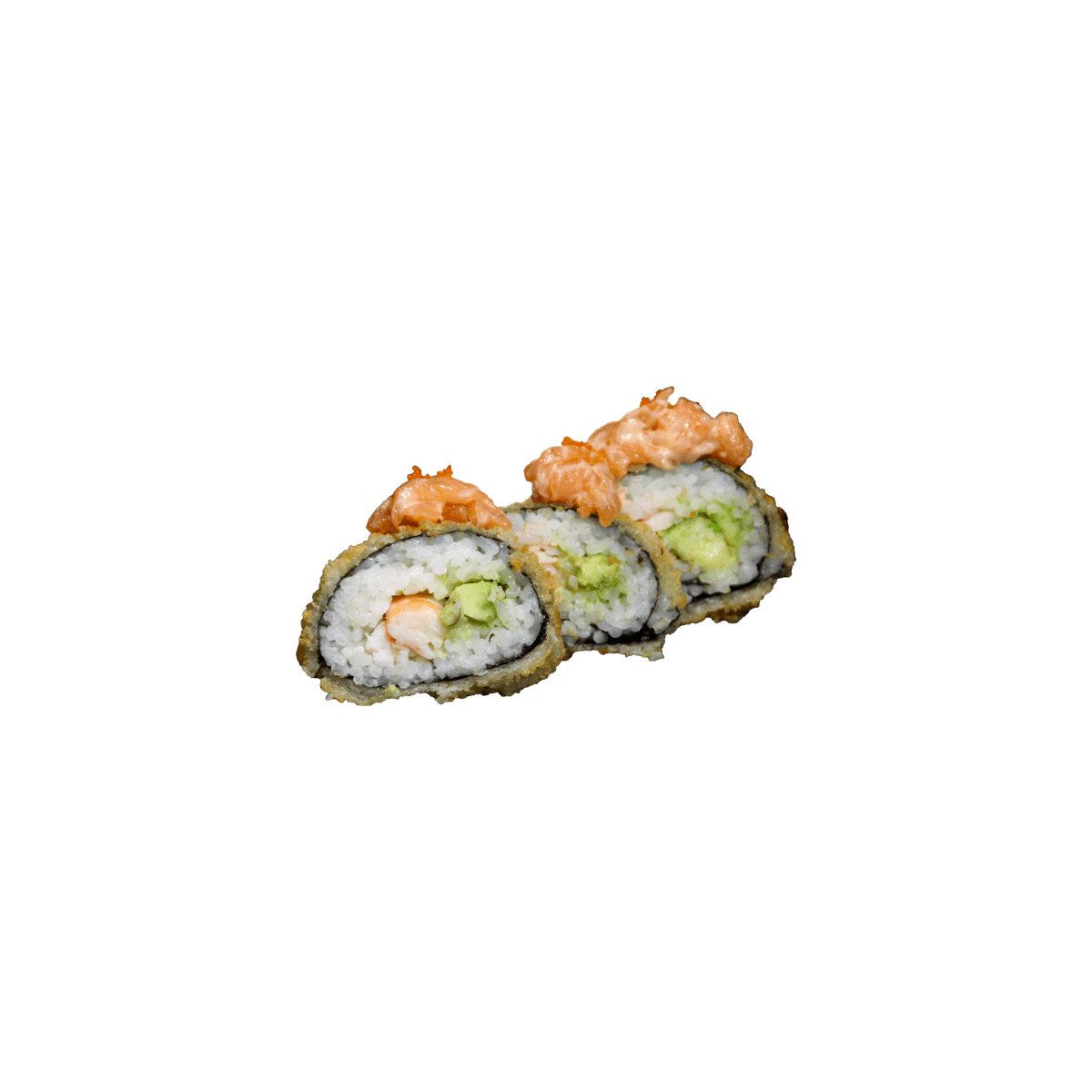 Roll de riz enrobé de tempura et frit - Crevette, cheese, avocat, tartare de thon saumon épicé - 6 pièces
