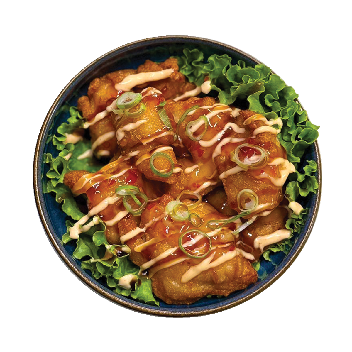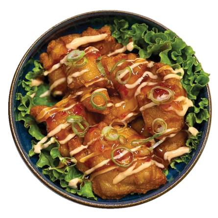 Roll poulet frit, boursin, curry, cébette, oignon frit, sauce...