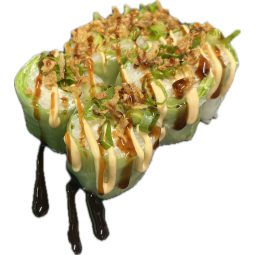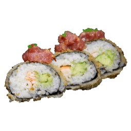 Maki inversé enrobé de crevette, avocat, wakamé, mayo-spicy,...